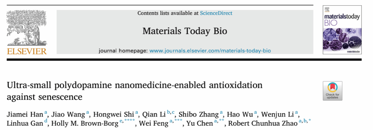 2023年1月,国产亚洲精品美女久久久赵春华教授团队发表题为Ultra-small polydopamine nanomedicine-enabled antioxidation againstsenescene的研究论文。该研究开发了具有逆转氧化应激诱导衰老的超小聚多巴胺纳米颗粒UPDA NPs,并通过多种细胞与生物模型在细胞与分子生物学水平上揭示了UPDA NPs的抗衰老机制。